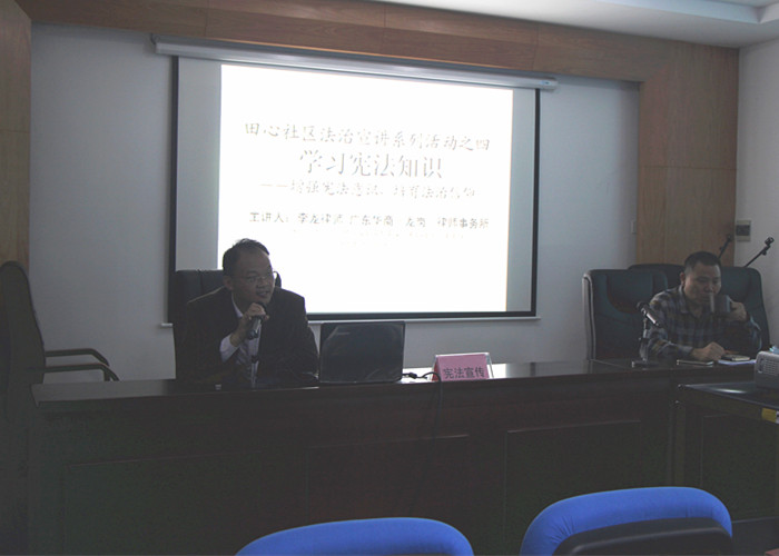 2015年12月3日,田心社区举办法制宣讲活动,向社区居民普及法律知识,学习宪法知识。
