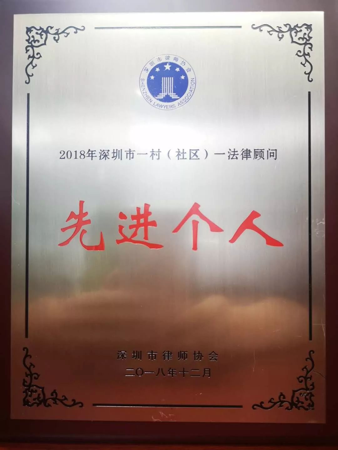 黄小明律师获评 深圳市一村(社区)一法律顾问 先进个人